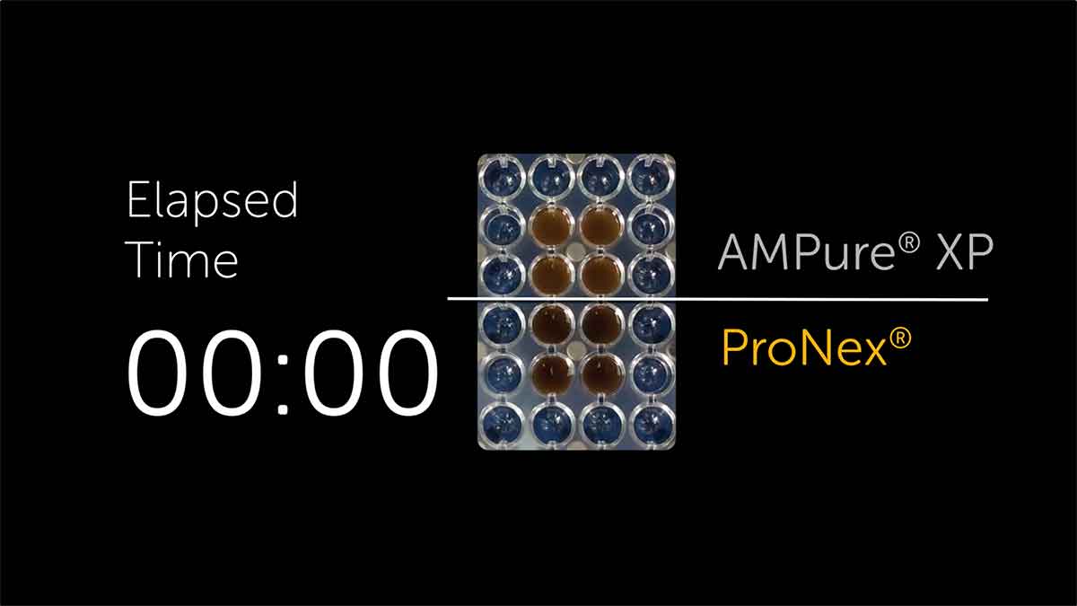 The ProNex® Size-Selective Purification System enables the rapid and efficient magnetic resin-based purification of double-stranded DNA (dsDNA) for next-generation sequencing (NGS), polymerase chain reaction (PCR) and general molecular biology applications. The ProNex® System allows users to select the desired size of purified dsDNA fragments, from 100bp to 750bp. The novel reagent formulation provides significantly improved selectivity, reproducibility and yield relative to traditional dsDNA purification methods. In addition, the ProNex® System can be used in both manual and automated high-throughput workflows.